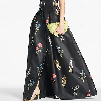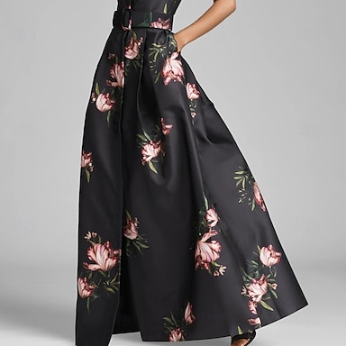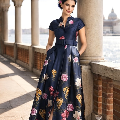 Ligne A Longueur au sol Robe d'invité de mariage Robe Fleurie Robe de Soirée Élégant ancien Floral Manche Courte Col Bateau Fête de jardin Mariage Poche Jacquard avec Imprimé floral Plis
