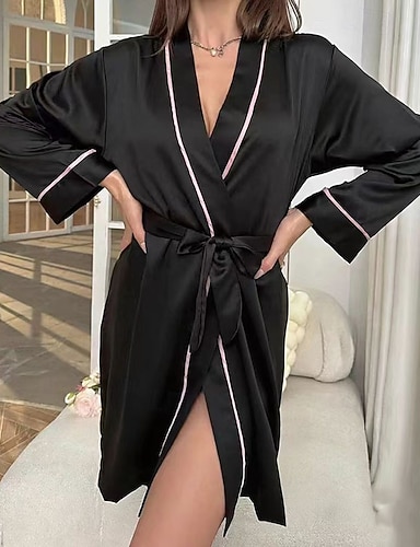 Femmes Loungewear Robe Chemise de Nuit Mode Occasionnel Doux Couleur Unie Patchwork Robes Maison Vacances manche longue Col en V Noir Champagne Rose Claire Vin Bleu de minuit Été Printemps Automne