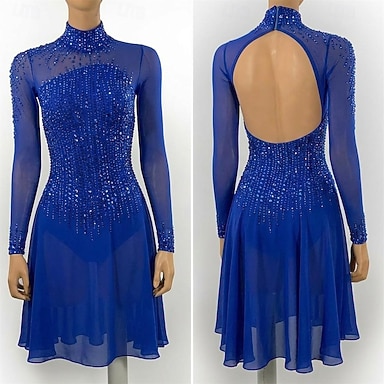 Robe de patinage artistique Femmes Patinage Robe Bleu Patchwork Dos Nu Élastique Entraînement Compétition Tenue de Patinage Classique cristal pailleté manche longue Patinage sur glace Patinage