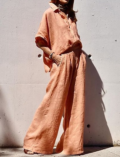 Femmes Chemise Ensembles en coton et lin Ensembles deux pièces manche longue Pantalon Long Revers Couleur Unie Boutons Simple Occasionnel Confort Quotidien Maison Rue Bleu Noir Rose Claire Été