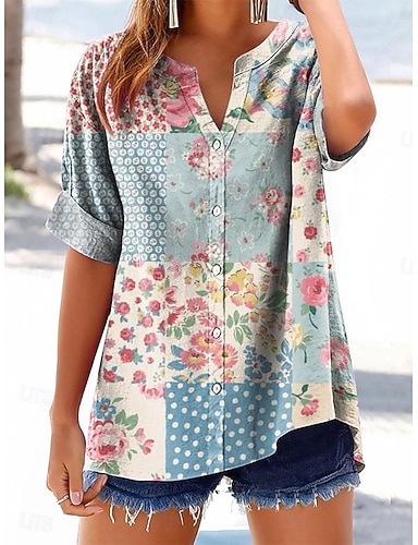 Femmes Chemise Boutons Imprimé Fleuri Graphique Vacances Quotidien Occasionnel Manche Courte Col en V Hauts Réguliers Quotidien Fête Sortir Bleu Été Printemps