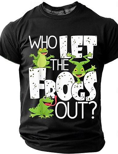 T-shirt noir homme humoristique « Qui a laissé sortir les grenouilles ? » avec un dessin animé de grenouilles et un jeu de mots. Idéal pour les amoureux des grenouilles et des animaux. Tailles : S, M,