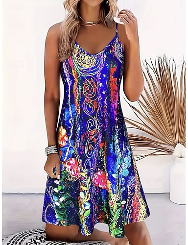 Femmes Mini Robe Robe trapèze Robe Nuisette Robe à épaules dénudées Vacances Occasionnel Plage Sortir Coupe régulière Fleuri Graphique Sans manches Col en V Bretelles spaghetti Bleu Blanche Bleu Roi