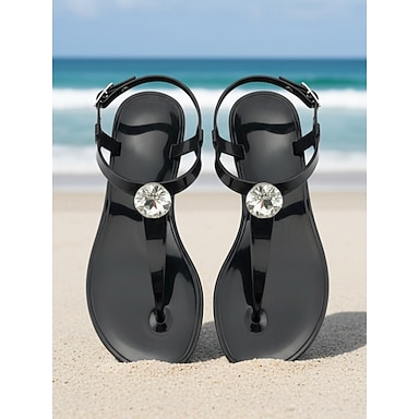 Sandales élégantes en plastique noir pour femmes - tongs imperméables à bride en T ornées de strass scintillants, idéales pour les vacances à la plage et les séjours en bord de mer. &vêtements d'été