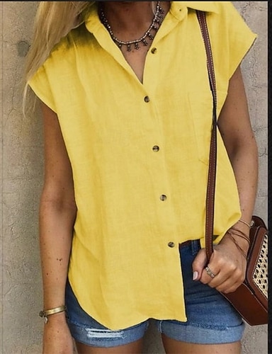 Femmes Chemise Chemises en coton et lin Chemise de Plage Chemise Boutonnée Couleur Unie Uni Vacances Mode Occasionnel Sans manches Col Rabattu Hauts Réguliers Vêtements de rue Plage Fête Jaune Ét