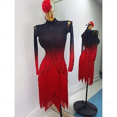 Danse de la salsa latine Robe Strass Gland Fantaisie Femme Utilisation Entraînement manche longue Maille Fibre de Lait