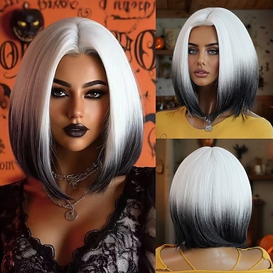 Perruque Synthétique Droit crépu Lisse naturel Coupe dégradée Avec frange Fabriqué à la Machine Perruque 28 pouces A1 Cheveux synthétiques Femmes Classique Confortable Dégradé de couleur Noir Blanc