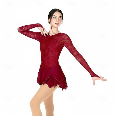 Robe de patinage artistique Femmes Fille Patinage Robe Noir Rouge Trou de pouce Ourlet asymétrique Maille Spandex Dentelle Élastique Entraînement Pratique Professionnel Tenue de Patinage Chaleur
