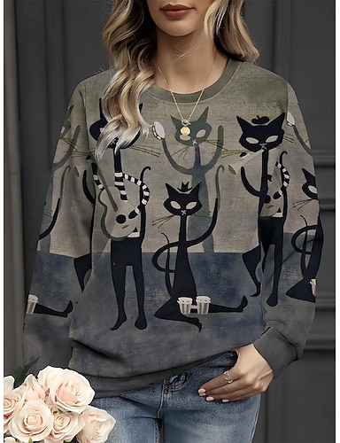 Noël Femme Sweat-shirt Pullover Graphique Animal Chat Actif Mignon Décontracté Manches Longues Col Ronde Regular Tops Street Décontracté Impression Fête Violet Marron Vert Printemps Automne Hiver