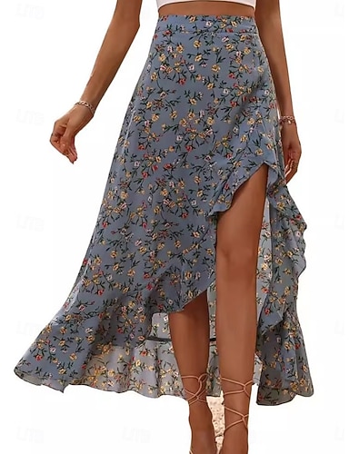 Femmes Mode Sexy Occasionnel Mi-long Taille haute Jupes Floral Imprimé Fendu Non Elastique Quotidien Vacances Bleu Noir Jaune Été Polyester