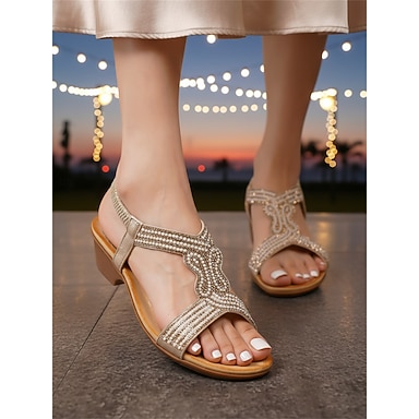 Sandales compensées pour femmes, couleur champagne, ornées de perles - élégantes chaussures habillées à brides et petit talon, parfaites pour les soirées de vacances, confortables et glamour pour les