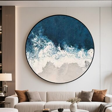 Cadre peinture à l'huile 3D fait à la main, vague océanique, art mural circulaire avec palette de couleurs vibrantes, tons bleus riches et coups de pinceau complexes mettant en valeur la texture en