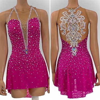 Robe de patinage artistique Femmes Fille Patinage Robe Rose Patchwork Dos Nu Spandex Maille Haute Élasticité Entraînement Professionnel Compétition Tenue de Patinage Classique cristal pailleté manche