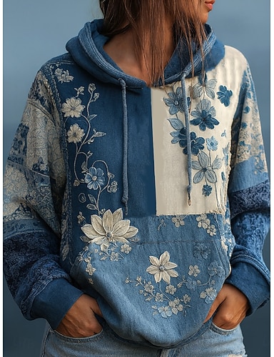 Sweat à capuche patchwork vintage boho en impression 3D pour femmes sweat-shirt floral pull-over décontracté manches longues avec capuche vêtements de tous les jours patchwork impression poche