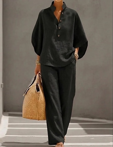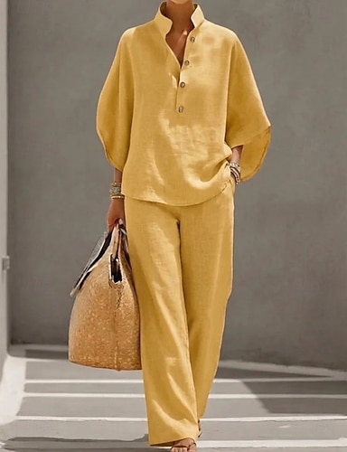 Femmes Ensembles en coton et lin Manche 3/4 Col montant Couleur Unie Quotidien Affligé Occasionnel Quotidien Noir Jaune Vin Été Coupe Ample