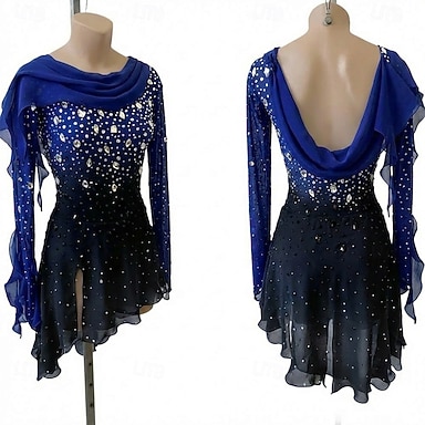 Robe de patinage artistique Femmes Patinage Robe Bleu Patchwork Dos Nu Élastique Entraînement Compétition Tenue de Patinage Classique cristal pailleté manche longue Patinage sur glace Patinage