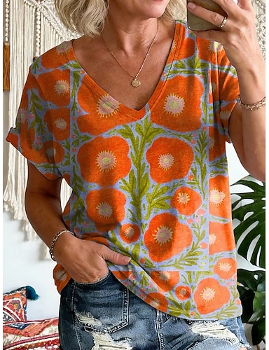 Femmes T-shirt Imprimé Fleuri Graphique Graffiti Bohème ancien Occasionnel Manche Courte Col en V Hauts Réguliers Quotidien Bleu Violet Orange Vert Été Printemps