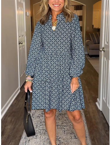 Robe Maxi Femme En Lin Comme Robe Tunique Décontractée Quotidienne Coupe Ample Imprimé Graphique Géométrique Manches Longues Col V Bleu Orange Vert Rose Pink Été Printemps