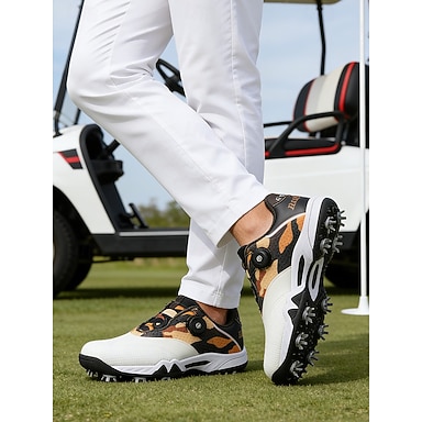 Chaussures de golf orange et blanches pour hommes, avec une adhérence améliorée, tendance et confortables, parfaites pour les terrains de golf et les sports de plein air.