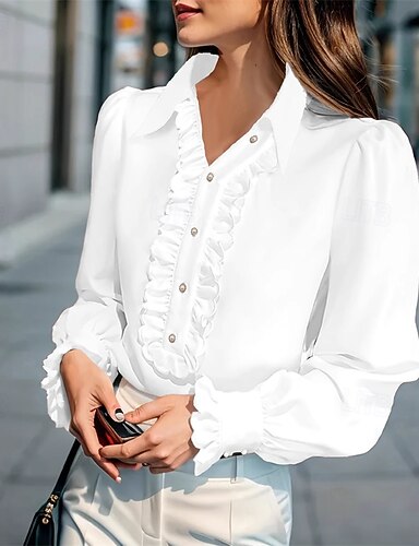 Femmes Chemisier Hauts Élégants Hauts en mousseline de soie Froncé A Volants Patchwork Couleur Unie Uni Élégant ancien Mignon manche longue Col Polo Hauts Réguliers Quotidien Travail Fête Blanche