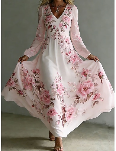 Femmes Robe Midi Robe Plissée Fête Occasionnel Boho Date Coupe Ample Fleuri Graphique manche longue Col en V Rose Claire Été Printemps