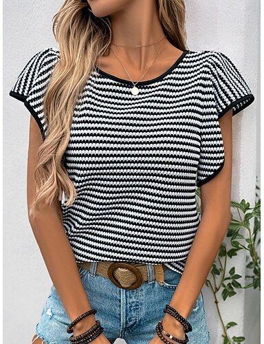 Femmes T-shirt A Volants Imprimé Rayé Mode Élégant Classique Manche Courte Col ras du cou Hauts Réguliers Quotidien Sortir Week-end Noir Été Printemps