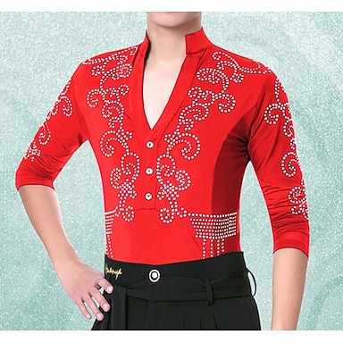 Chemise de danse latine rouge à strass pour homme, décolleté en V profond, manches 3/4, haut de performance de salon