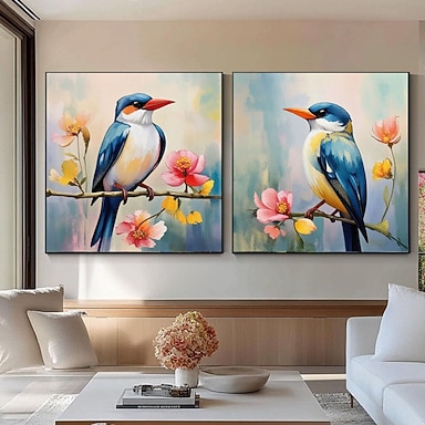 Peinture à l'huile colorée peinte à la main représentant un oiseau aux branches florales, dans un style impressionniste. Décoration murale représentant la nature et la faune sauvage. Peinture d'oiseau