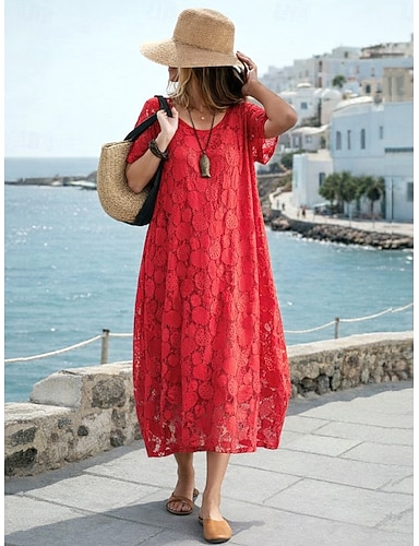 Femmes Robe Midi Robe trapèze Robe d'été Occasionnel Quotidien Coupe Ample Uni Manche Courte Col ras du cou Rouge Été