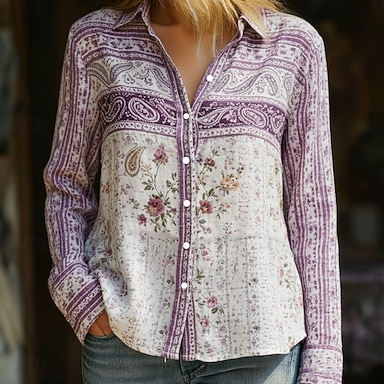 Femmes Chemise Chemise Bohème Faux coton lin Boutons Imprimé Fleuri Bohème Actif Occasionnel manche longue Col de chemise Hauts Réguliers Quotidien Fête Violet Printemps Automne