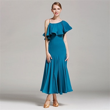 Robe de danse de salon élégante à une épaule avec manches à volants et jupe fluide pour les spectacles de danse et les entraînements