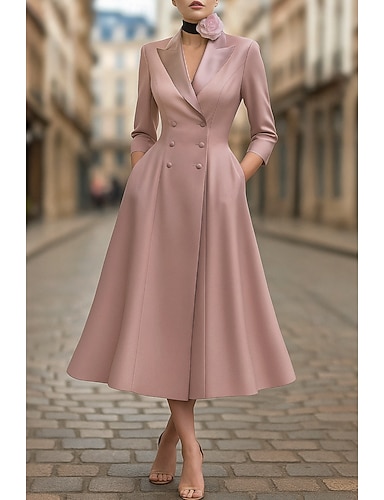 Femmes Robe smoking Ligne A Formel Crêpe Extensible Élégant manche longue Longueur thé Longueur midi Revers en Pointe Col en V Boutonnage simple deux boutons