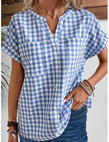 Femmes Chemise Chemisier Avec Poches Boutons Plaid ancien Élégant Classique Sans manches Manche Courte Col en V Hauts Réguliers Quotidien Fête Sortir Bleu Été Printemps