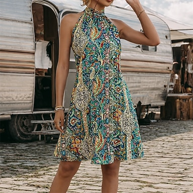 Set Bohème Rétro Vintage Boho Robe Sans manches Hippie Disco Paisley Bohème Déguisement Femmes Mascarade Festival de Musique Soirée à thème rétro Adulte Robe Été