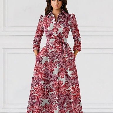 Robe A-Ligne Longueur Plancher Robe Chemise Robe Invité de Mariage Robes Formelles Robe Mère de la Mariée Manches Longues Col Chemise Élégante Vintage Formelle avec Nœud(s)