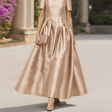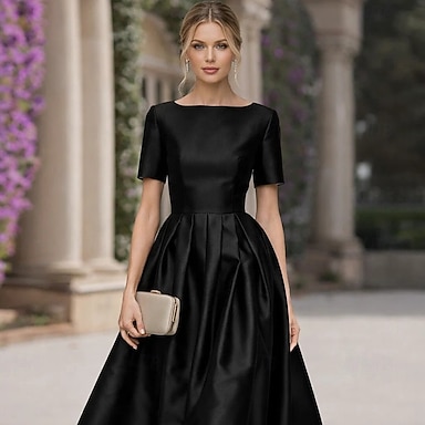 Ligne A Longueur thé Robe de Cérémonie Robes de Cocktail Élégant Manche Courte Col Bateau Mariage Formel Taffetas avec Perlé Plis