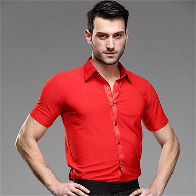 Chemise rouge de danse latine pour homme, manches courtes, coupe ajustée, haut de performance de salon