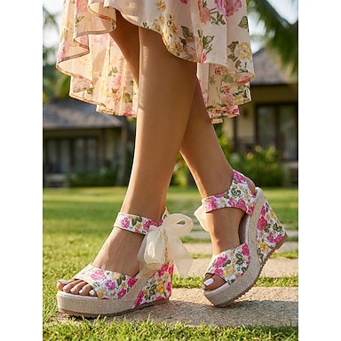 Sandales compensées à fleurs rose vif pour femmes - espadrilles confortables à plateforme avec bride à nœud à la cheville, idéales pour les séjours en plein air et les vacances tropicales. &mariages