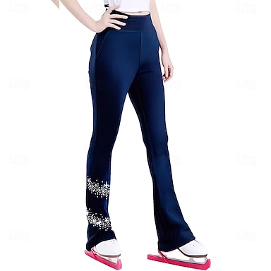 Pantalon de patinage artistique pour femmes et filles, noir, extensible, pour l'entraînement et la compétition, chaud et thermique, orné de cristaux et de strass.