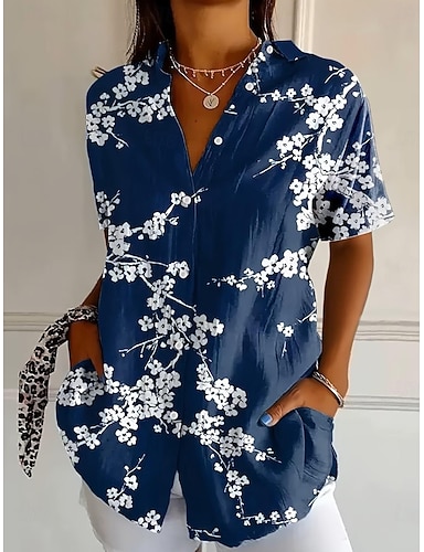 Femmes Chemise Chemise Décontractée Hauts d'été Boutons Imprimé Fleuri Graphique ancien Élégant Moderne Manche Courte Col en V Col de chemise Épaules Dénudées Hauts Longs Quotidien Bleu Bleu de