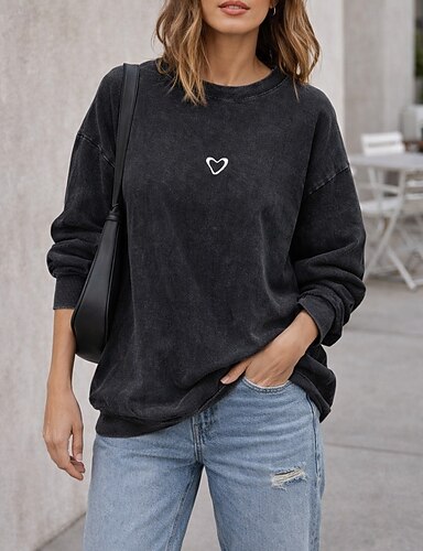 Woman's 100% coton t-shirt impression vintage délavé couleur unie cœur vintage stylé décontracté à manches longues col rond hauts réguliers quotidien sortant noir été printemps automne