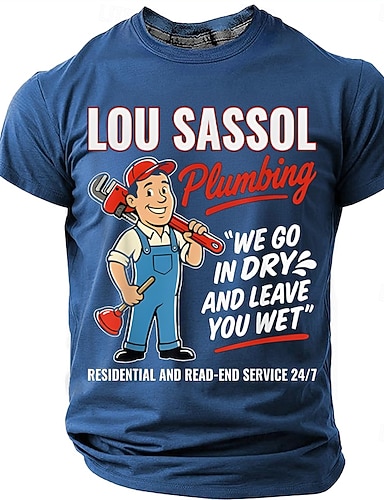 T-shirt humoristique pour homme Lou Sassol, plombier, avec un jeu de mots coquin sur le thème de la plomberie. On entre sec et on vous laisse mouillé. Cadeau original et amusant. Style rétro, manches