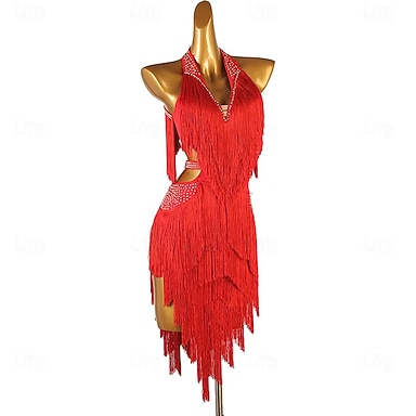 Robe de danse latine rouge à franges pour femme, bretelles spaghetti et décolleté en V plongeant, idéale pour les compétitions de bal de salon.