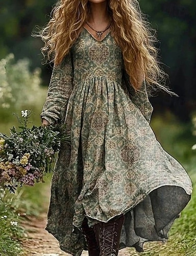 Femmes Robe Maxi Robe Vintage Robe Décontractée ancien Quotidien Extérieur Vacances Coupe régulière Fleuri manche longue Col en V Vert Printemps Automne