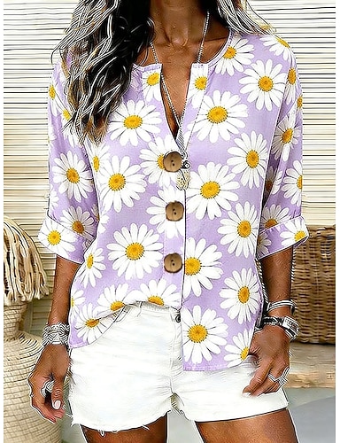 Femmes Chemise Imprimé Fleuri Graphique Marguerite Élégant ancien Tropical manche longue Col en V Hauts Réguliers Quotidien Fête Tenue de plage Bleu Rose Claire Violet Vert Gris Été Printemps