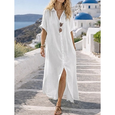 Femmes Robe maxi Faux coton lin Robe Chemise Robe Décontractée Basique Occasionnel Quotidien Vacances Coupe régulière Uni manche longue Col de chemise Blanche Vert Claire Rose Claire Été