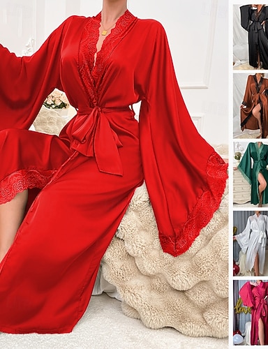 Femmes Robe Occasionnel Doux Satin Couleur Unie Dentelle Pantalon Quotidien Maison Lit manche longue Col en V Noir Blanche Vin Rouge Marron Été Printemps Coupe régulière