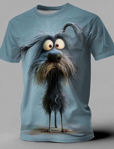 T-shirt homme imprimé numérique 3D avec un chien à la crinière ébouriffée et aux grands yeux. Manches courtes, style humoristique. Tailles : S, M, L, XL, XXL, XXXL.