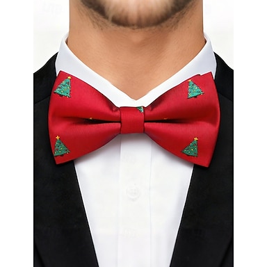 Nœud papillon de Noël pour homme en polyester, orné de flocons de neige et de sapins, disponible en rouge, vert et bleu marine.