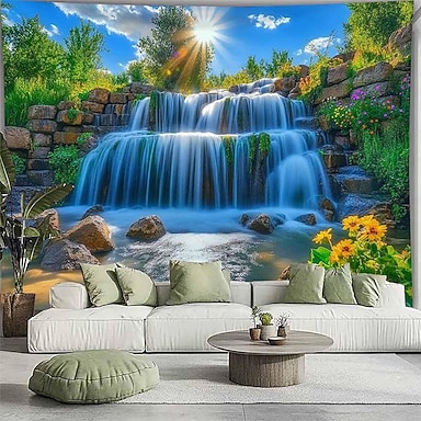 Tapisserie murale représentant une cascade à plusieurs niveaux, un paysage de montagne ensoleillé, une forêt verdoyante et des fleurs colorées. Décoration murale pour salon, chambre ou extérieur.